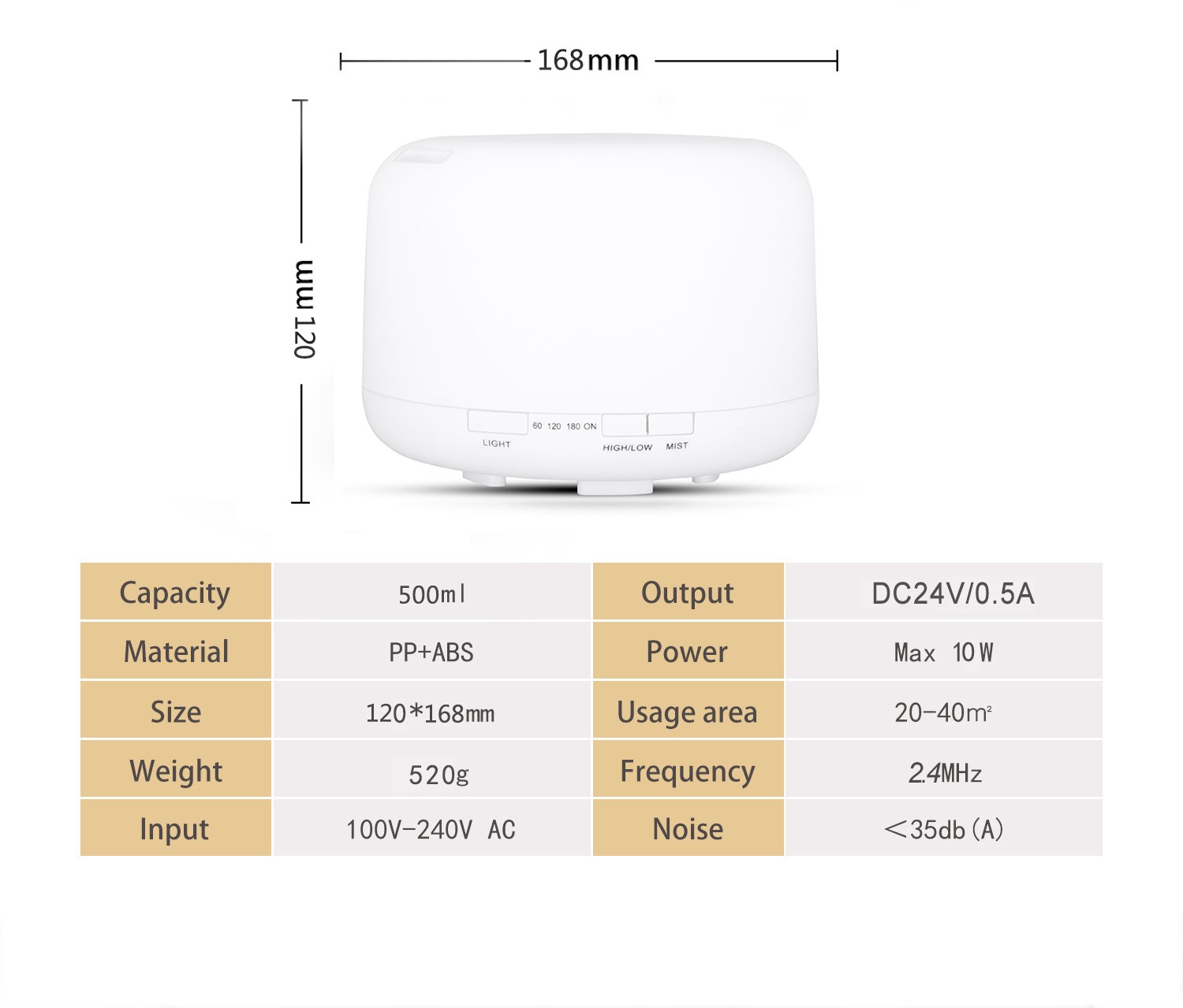 - Customizable Settings: Timer (60/120/180 mins), high/low mist modes.