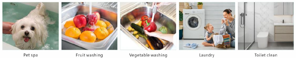 - Applications: fruit and vegetables washing, Laundry, Bathing, Pet cleaning, Toilet disinfecting, machinery cleaning, etc.