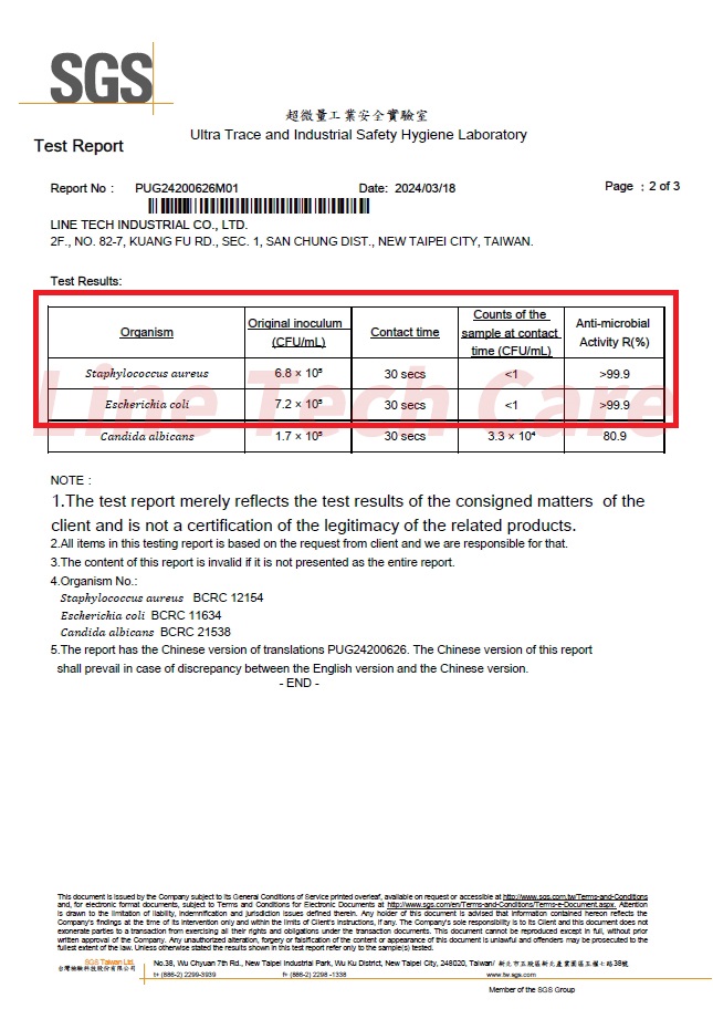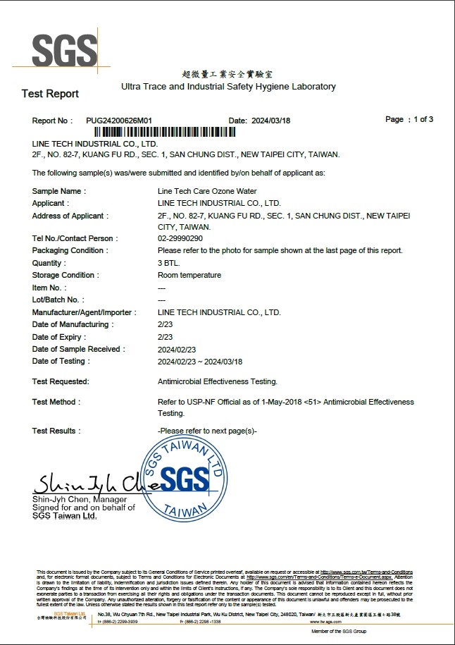 Many research and report have shown that ozone water can eliminate most of microorganisms in a very short time.The following test report tested by SGS certify our product-Line Tech Care Ozone Water can eliminate Staphylococcus aureus and Escherichia coli within 30 seconds.